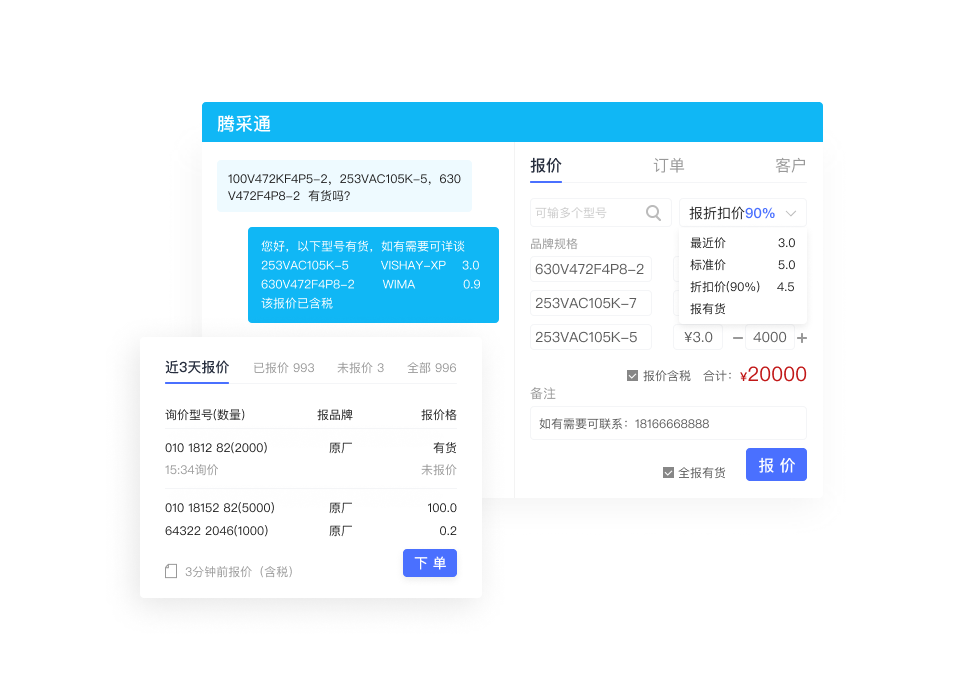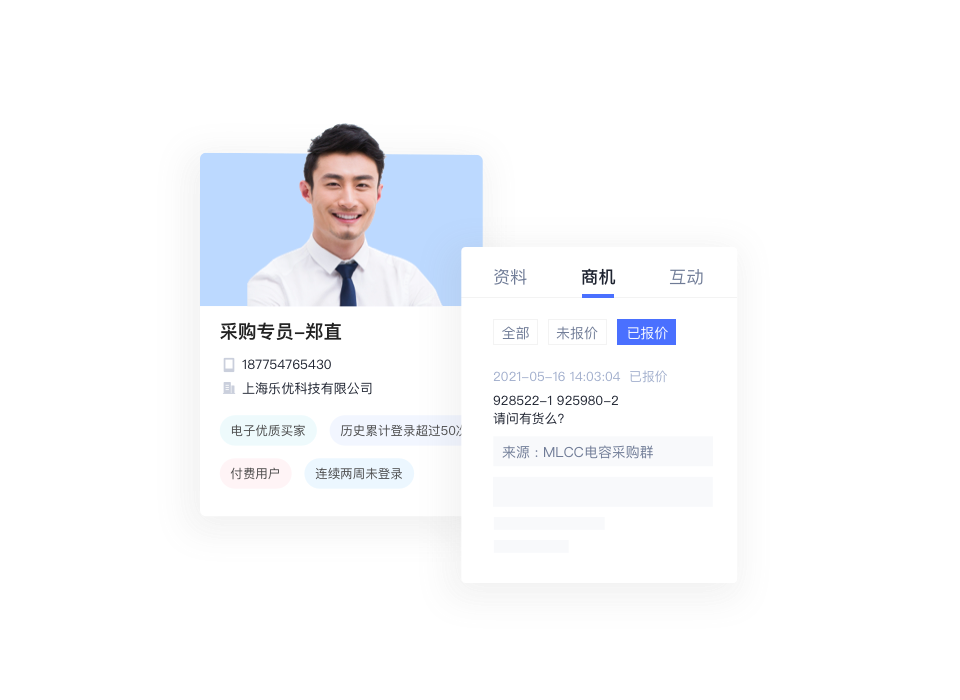 自动抓取QQ行业群内的求购商机,NLP解析商机数量超千万/天。自动匹配库存后,智能匹配上的商机支持自动发送报价单,实现售前完全自动化,助力企业交易效率显著提升。