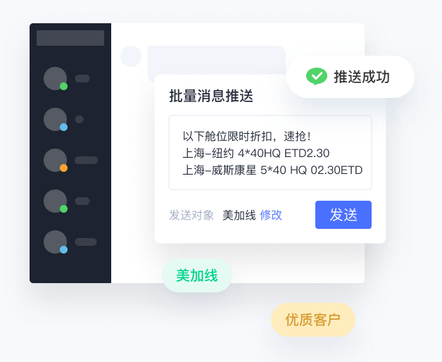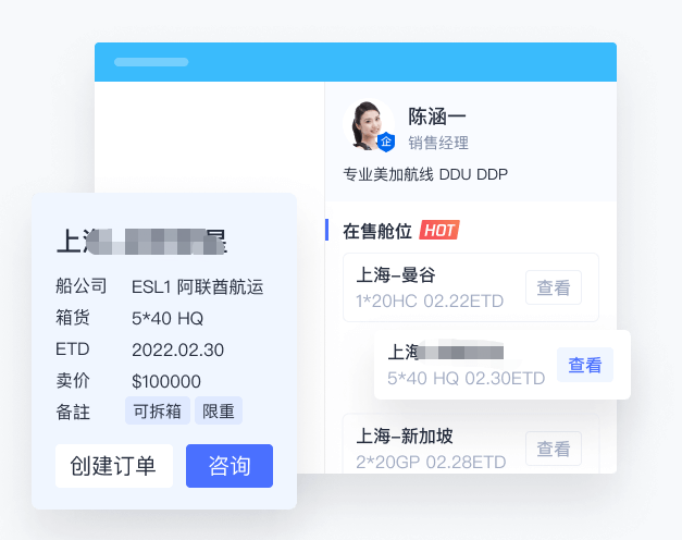在售舱位实时展示于企业名片下方,舱位7*24h曝光,客户可通过对话框右侧窗口自助查询、快捷询价;聊天过程快捷查询自有舱位资源、一键报价,沟通效率有保障。