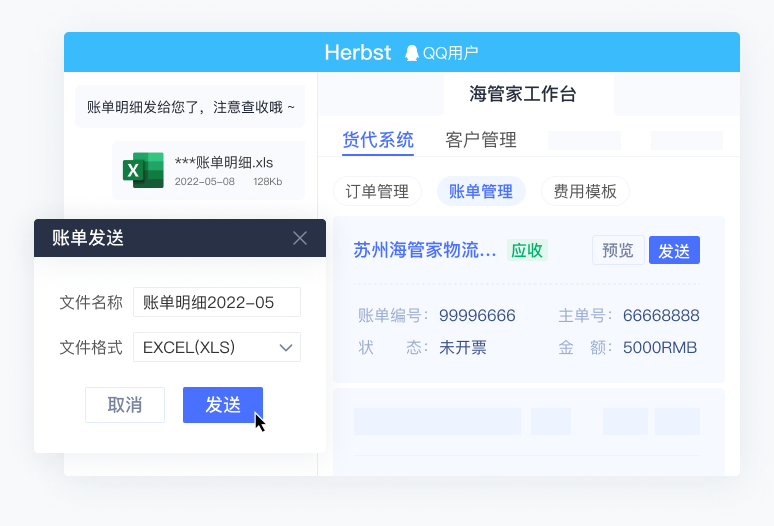 对接海管家货代系统,实现操作系统与即时通讯工具的高效结合。边聊天边查询系统信息、进行系统联动操作、一键发送系统文件至聊天好友,与客户/供应商高效沟通对接。