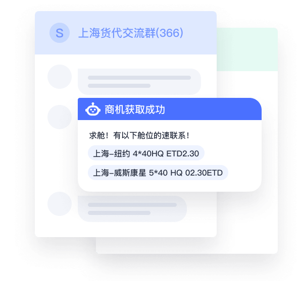 QQ群商机实时监控,NLP语义识别,订阅起运港、目的港路线,系统自动抓取、分析群信息,7*24h精准推送商机,实现高效获客。