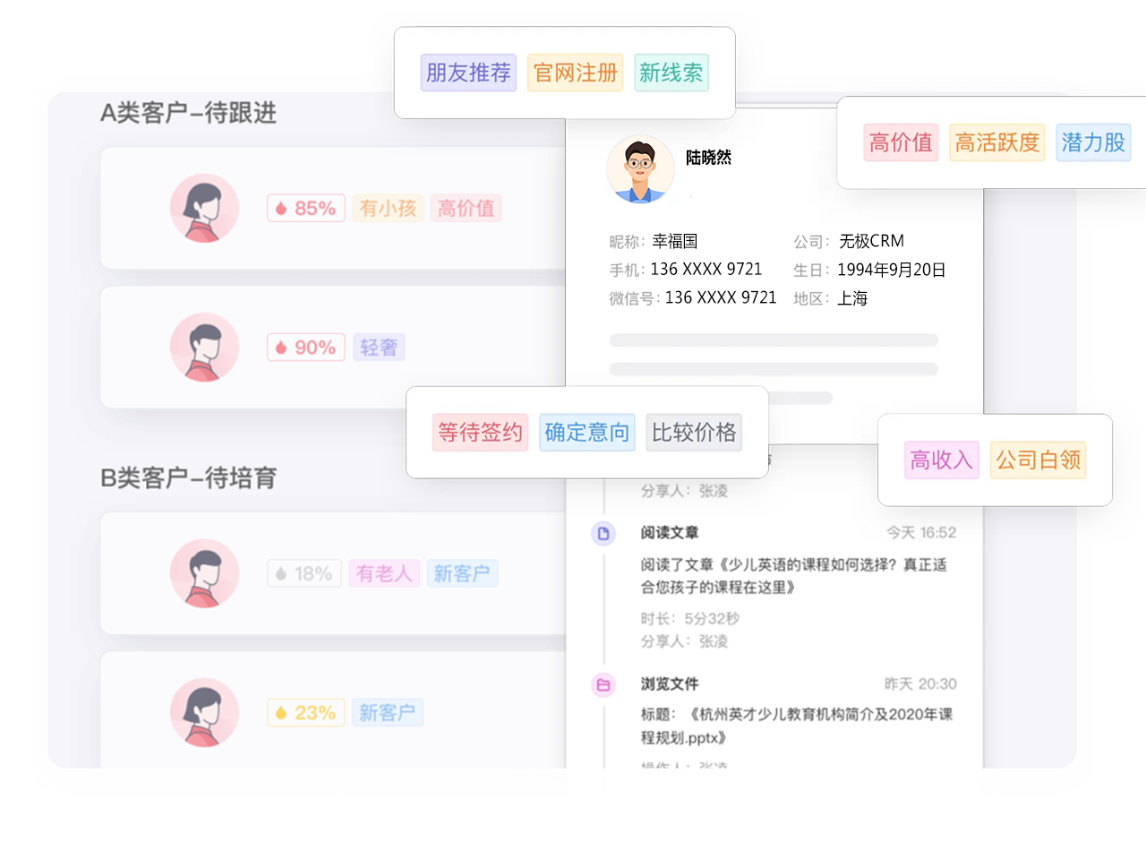 客户管理,把控全局 无极CRM能帮助销售管理好手上的客户资源,通过 客户信息、跟进过程、关联商机。合同等的管理, 与客户建立紧密的联机,赢得强有力的竞争力优势。