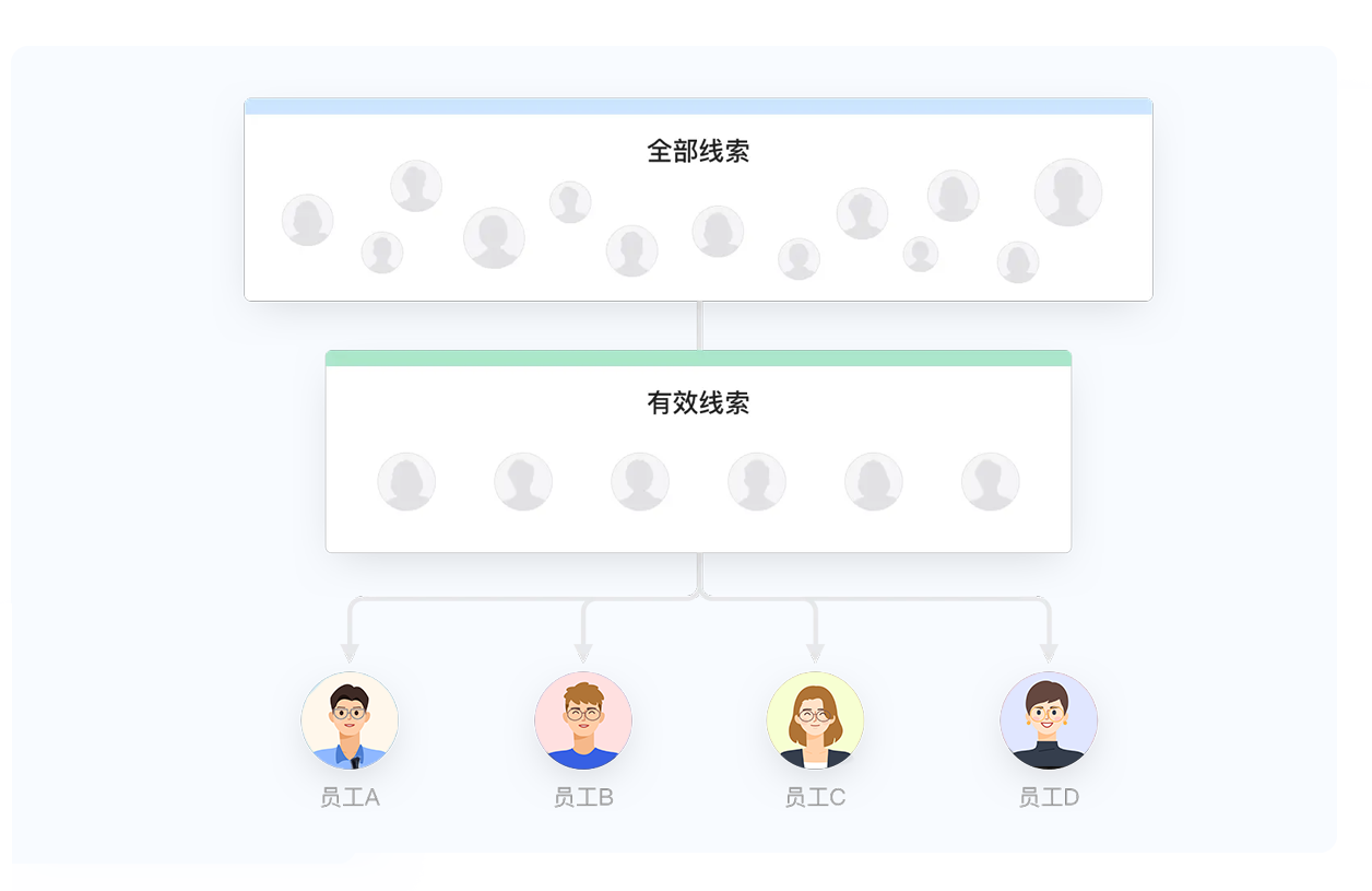 有效的线索管理是产生更 多销售机会的最有效途径 从线索的获取,筛选到转换为潜在客户,每一步都可 根据线索的跟进情况作出下一步正确的决策,把握 更多 高质量线索。